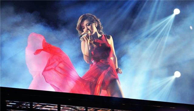 金色卷发携一袭红长裙,整体造型的气质俨然就是一个高贵的公主在悠唱着自己的心声。